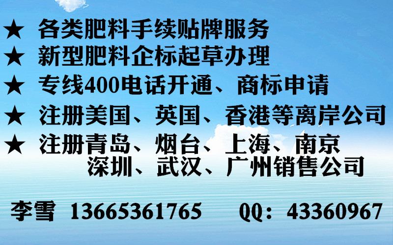 ★ 提供各类肥料手续、化肥生产手续、肥料生产手续、肥料贴牌手续、各类肥料执行标准的复混肥料、掺混肥料、有机无机复混肥料手续、生物有机肥肥料手续、复合微生物肥料手续、微生物菌剂肥料手续、含腐植酸水溶肥料生产手续、含氨基酸水溶肥料生产手续、大量元素水溶肥料生产手续,微量元素水溶肥料手续生产手续。