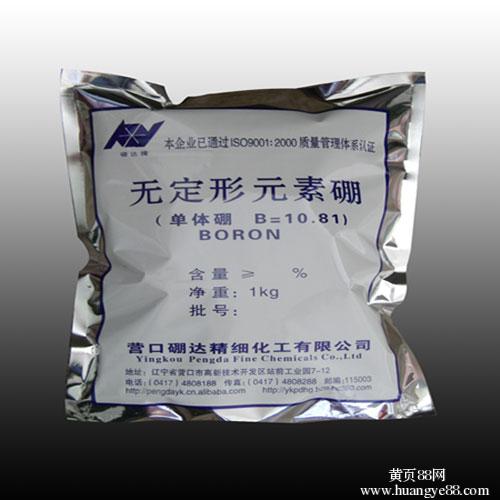 无定形硼粉又称单体硼、元素硼,它是灰黑色或棕色非定形粉末.化学性质较活泼,无味、无臭,在空气中和常温下稳定,加热至300℃被氧化,达到700℃即燃烧,燃烧时火焰呈红色,微量气化的硼火焰呈绿色.元素硼不溶于水,,可溶于冷的浓碱溶液中并分解出氢气,及浓氧化成硼酸。在高温时,硼能与氧、氮、硫、卤素及碳相互作用,硼也可以与许多金属直接化合,生成金属化合物,也能与有机化合物反应可生成硼直接和碳相联的化合与物或硼与碳之间有氧存在的化合物。