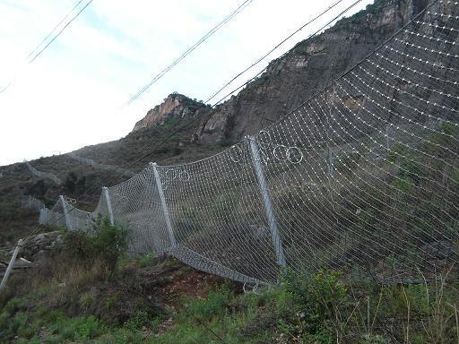 被动防护系统是由钢丝绳网,钢丝格删网.锚杆,工字钢柱,上下拉锚绳,减压环,底座及上下支撑绳等部件构成.系统由钢柱和钢绳网联结组合构成一个整体,对所防护的区域形成面防护,从而阻止崩塌岩石土体的下坠,起到边坡防护的作用. SNS被动防护系统的特点在于:系统的柔韧性和栏截强度足以分散传递预计的落石冲计冲击动能,减压环的设计和采用使系统的抗冲击能力得到进一步提高.与钢性拦截与砌浆挡墙相比:该变了原有施工工艺,使工期和资金得到减少。