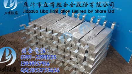 *常用的铝合金阳极有Al-Zn-In系和Al-Zn-Hg系阳极,适用于海水中的船舶、码头港口与海洋设施、海水冷却水系统和储罐沉积水部位等构筑物的阴极保护。铝锌铟系(AZI系)牺牲阳极是用高纯度铝及锌、铟等金属合金化而铸成的。铝合金阳极生产执行GB4948-2002《铝-锌-铟系合金牺牲阳极》。