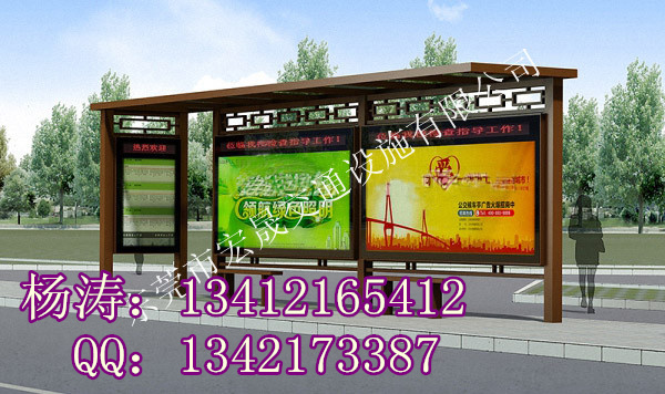 候车亭常用的材质有俩种,一种不锈钢材料制作的候车亭较易清理,而另一种则是镀锌钢管制作的候车亭色彩则较为美观、多样,宏晟制作公交候车亭广告灯箱尺寸为:单体灯箱1800mm*3600mm,广告画面1500mm*3500mm,