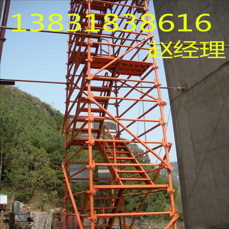 9.安全爬梯每隔1.5米安放一张带踏步Z字形楼梯,每隔4-5米需安置扣墙件,大搭设高度为100米