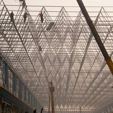 由多根杆件按照一定的网格形式通过节点连结而成的空间结构。构成网架的基本单元有三角锥,三棱体,正方体,截头四角锥等,由这些基本单元可组合成平面形状的三边形,四边形,六边形,圆形或其他任何形体。具有空间受力、重量轻、刚度大、抗震性能好等优点;可用作体育馆、 影剧院、展览厅、候车厅、体育场看台雨篷、飞机库、双向大柱网架结构距车间等建筑的屋盖。缺点是汇交于节点上的杆件数量较多,制作安装较平面结构复杂。