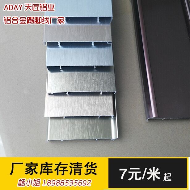 产品介绍:铝合金踢脚线是由是由铝合金面板和高强内衬复合压制成各种样式和规格.安装时,下料切割后只需用螺栓和插接件固定在墙上即可,本型材与传统木制踢脚线,门窗套相比,更加美观牢固,绿色环保,而与传统不锈钢踢脚线及门窗套相比,价格低廉,尤其是安装快捷便利.