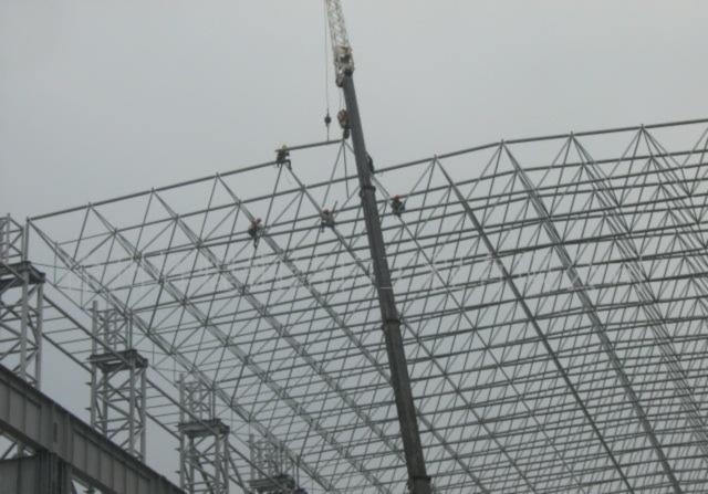 由多根杆件按照一定的网格形式通过节点连结而成的空间结构。构成网架的基本单元有三角锥,三棱体,正方体,截头四角锥等,由这些基本单元可组合成平面形状的三边形,四边形,六边形,圆形或其他任何形体。具有空间受力、重量轻、刚度大、抗震性能好等优点;可用作体育馆、 影剧院、展览厅、候车厅、体育场看台雨篷、飞机库、双向大柱网架结构距车间等建筑的屋盖。缺点是汇交于节点上的杆件数量较多,制作安装较平面结构复杂。