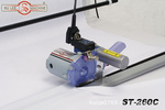 断布机涉及一种裁床铺料断布设备,应用于服装、皮塑、纺织、地毯等行业的裁床铺料切割。本实用新型由主机、导轨、轨道、轨道支架和小刀片组成,主机由手柄、电机、开关、圆盘刀片和计数器构成,主机固定于导轨支架上,小刀片固定于导轨底座的刀槽中,与圆盘刀片构成一个弹性贴紧剪刀口,轨道由轨道支架固定于裁床上,导轨底座位于轨道表面的导轨滑行槽中滑行。具有自动断布、省工、省力、省电、省布等特点。