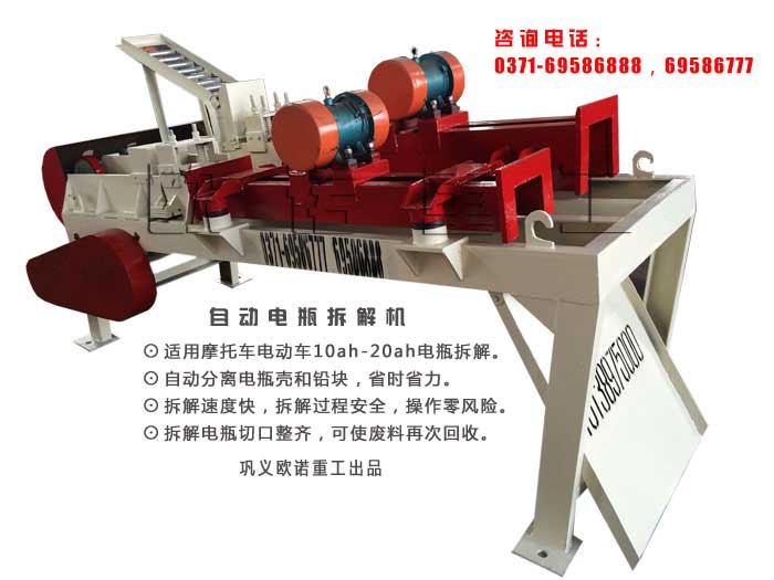 根据以上几种情况巩义市欧诺机械研究出浦能电瓶拆解机、京球电瓶拆解机能够自动化*的将废旧电瓶拆解机,提高了工作效率,低风险。