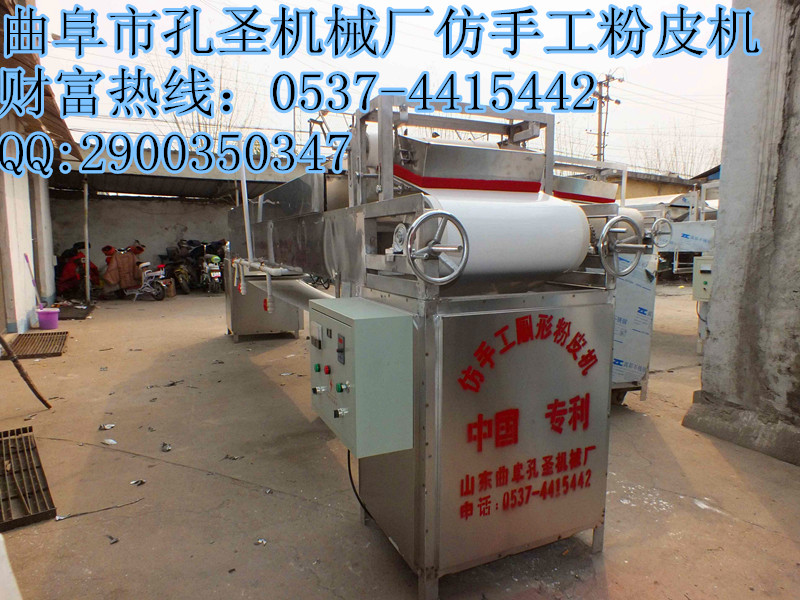 该机是结合了手工生产工艺原理,替代了人工 费时、费力,又不卫生的手工生产,4-5人即可操作,如果匹配上烘干线 ,将不再受天气影响制作,该机现已更新到六代机型,大产量可达到400-500市斤干淀粉,更换模具可根据客户如需直径大小的粉皮或方形粉皮,厚薄度可任意调整,其生产量是手工的10倍。适合各类淀粉加工。其加工生产流程如下: