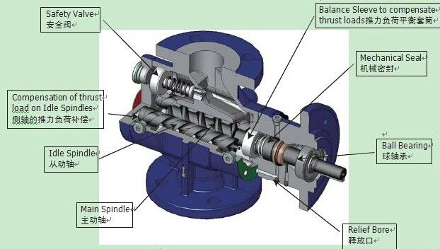 螺杆泵依靠螺杆相互啮合的容积变化来输送液体,当螺杆转动时,吸入腔一端的密封腔连续地向派出腔一端作轴向运动,使吸入腔的容积增大,压力降低,液体在压差作用下沿吸入管进入吸入腔,随着螺杆的转动,密封腔内的液体连续而均匀地沿轴向移至排出腔